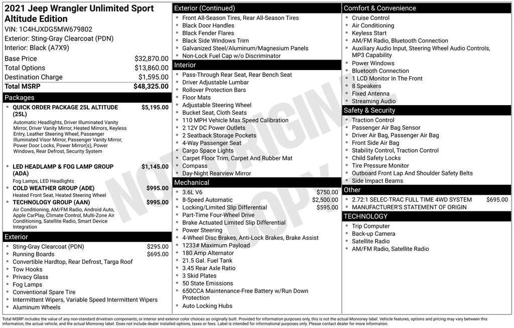 This 2021 Jeep Wrangler Unlimited Sport Altitude is a rugged and capable off-road SUV that's ready to take on any adventure. With its powerful 3.6L V6 eTorque engine and 8-speed automatic transmission, you'll have the performance to conquer any terrain. The Selec-Trac full-time 4WD system and anti-spin differential rear axle provide exceptional traction and control, while the side steps and Altitude package add a touch of style and convenience.