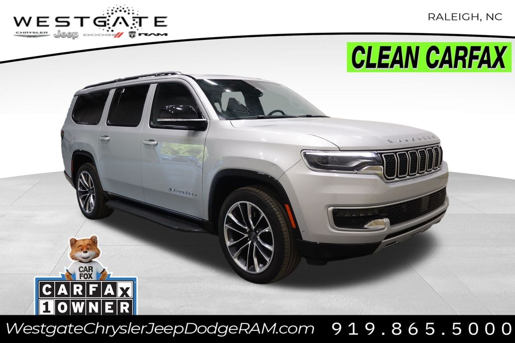 Clean CARFAX. CARFAX One-Owner. 10 Speakers, 3 Panel Sunroof, 3.55 Rear Axle Ratio, 3rd row seats: bench, 4-Wheel Disc Brakes, 40/20/40 2nd Row Bench Power Tip/Slide, 8-Passenger Seating, ABS brakes, Adjustable pedals, Adjustable Roof Rail Crossbars, Air Conditioning, Alloy wheels, AM/FM radio: SiriusXM with 360L, Anti-whiplash front head restraints, Apple CarPlay/Android Auto, Audio memory, Auto-dimming door mirrors, Auto-dimming Rear-View mirror, Auto-leveling suspension, Automatic temperature control, Brake assist, Bumpers: body-color, Compass, Delay-off headlights, Driver door bin, Driver vanity mirror, Driver's Seat Mounted Armrest, Dual front impact airbags, Dual front side impact airbags, Electronic Stability Control, Emergency communication system: Wagoneer Connect, Exterior Parking Camera Rear, Flexible Seating Group, Four wheel independent suspension, Front anti-roll bar, Front Bucket Seats, Front Center Armrest w/Storage, Front dual zone A/C, Front fog lights, Front reading lights, Full Length Floor Console, Fully automatic headlights, Garage door transmitter, Genuine wood console insert, Genuine wood dashboard insert, Genuine wood door panel insert, Heated door mirrors, Heated front seats, Heated steering wheel, Illuminated entry, Knee airbag, Leather Trimmed Bucket Seats, Low tire pressure warning, Memory seat, Navigation System, Normal Duty Suspension, Occupant sensing airbag, Outside temperature display, Overhead airbag, Overhead console, Panic alarm, Passenger door bin, Passenger seat mounted armrest, Passenger vanity mirror, Pedal memory, Power adjustable front head restraints, Power door mirrors, Power driver seat, Power Liftgate, Power passenger seat, Power steering, Power windows, Premium Group I, Quick Order Package 25J, Radio data system, Radio: Uconnect 5 Nav w/10.1" Display, Rain sensing wipers, Rear air conditioning, Rear anti-roll bar, Rear reading lights, Rear seat center armrest, Rear window defroster, Rear window wiper, Reclining 3rd row seat, Remote keyless entry, Reversible Carpet/Vinyl Cargo Mat, Security system, Speed control, Speed-sensing steering, Speed-Sensitive Wipers, Split folding rear seat, Steering wheel memory, Steering wheel mounted audio controls, Tachometer, Telescoping steering wheel, Tilt steering wheel, Traction control, Trip computer, Turn signal indicator mirrors, Variably intermittent wipers, Ventilated front seats, Voltmeter, Wheels: 20" x 9.0" Premium 2 Aluminum, Wheels: 22" x 9.0" Premium 3 Aluminum.