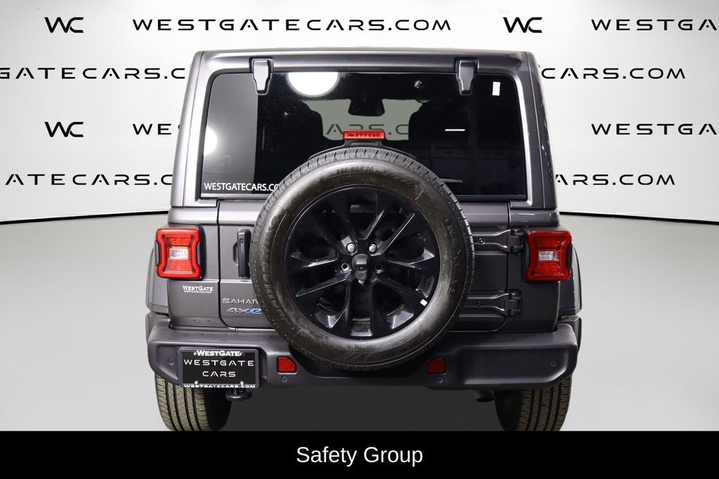 Safety is paramount in the Sahara 4xe, which comes equipped with advanced driver-assist technologies like Blind Spot Monitoring, Rear Cross-Path Detection, and ParkSense Rear Park Assist. The available Safety Group further enhances your peace of mind with features like Auto High Beam Headlamp Control and a Rear Window Defroster.