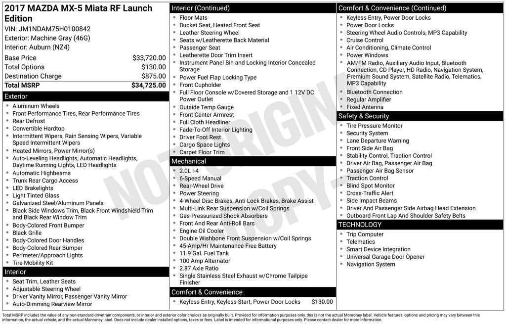 4-Wheel Disc Brakes, 9 Speakers, ABS brakes, Advanced Keyless Entry System, Air Conditioning, Alloy wheels, AM/FM radio: SiriusXM, Auto High-beam Headlights, Auto-dimming door mirrors, Auto-dimming Rear-View mirror, Automatic temperature control, Brake assist, Bumpers: body-color, CD player, Convertible HardTop, Convertible roof lining, Convertible roof wind blocker, Delay-off headlights, Driver vanity mirror, Dual front impact airbags, Dual front side impact airbags, Electronic Stability Control, Emergency communication system: Mazda Connect, Four wheel independent suspension, Front anti-roll bar, Front Bucket Seats, Front Center Armrest, Fully automatic headlights, Garage door transmitter: HomeLink, Glass rear window, Heated door mirrors, Heated Front Bucket Seats, Heated front seats, Illuminated entry, Leather Shift Knob, Leather Upholstery, Low tire pressure warning, Navigation system: MAZDA CONNECT, Occupant sensing airbag, Outside temperature display, Panic alarm, Passenger vanity mirror, Power convertible roof, Power door mirrors, Power steering, Power windows, Radio data system, Radio: AM/FM/HD w/Navigation & CD Player, Rain sensing wipers, Rear anti-roll bar, Rear window defroster, Remote keyless entry, Security system, Speed control, Speed-sensing steering, Sport steering wheel, Steering wheel mounted audio controls, Tachometer, Tilt steering wheel, Traction control, Trip computer, Variably intermittent wipers, Wheels: 17" Dark Silver Alloy.