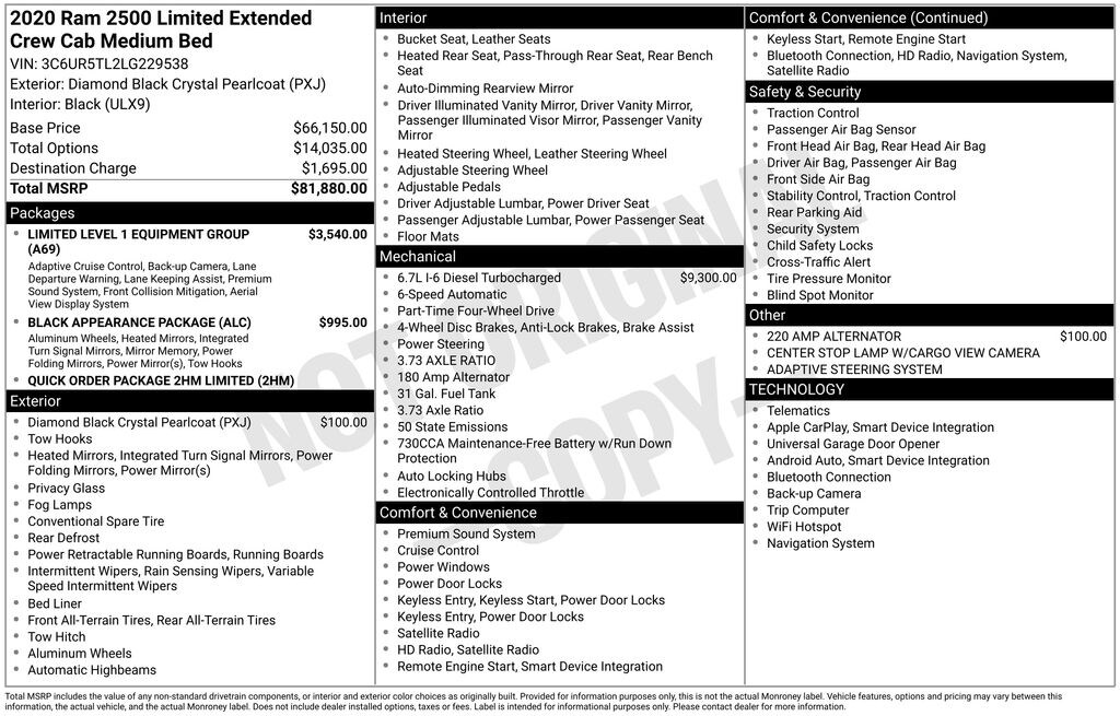 1-Year SiriusXM Guardian Trial, 10 Speakers, 17 Speaker harman kardon Premium Sound, 220 Amp Alternator, 3.73 Axle Ratio, 4-Wheel Disc Brakes, ABS brakes, Active Noise Control System, Adaptive Cruise Control w/Stop, Adaptive Steering System, Adjustable pedals, Air Conditioning, Alloy wheels, AM/FM radio: SiriusXM with 360L, Apple CarPlay, Apple CarPlay/Android Auto, Audio memory, Auto High-beam Headlights, Auto-dimming Rear-View mirror, Automatic temperature control, Black Appearance Package, Black Exterior Mirrors, Black Exterior Truck Badging, Black Grille Limited, Black Headlamp Bezels, Black RAM Head Tailgate Badge, Black Tail Lamp Bezels, Black Wheel Center Hub, Body Color Door Handles, Body Color Grille Surround, Bodyside moldings, Brake assist, Bumpers: chrome, Center Stop Lamp w/Cargo View Camera, Compass, Delay-off headlights, Disassociated Touchscreen Display, Driver door bin, Driver vanity mirror, Dual front impact airbags, Dual front side impact airbags, Electronic Stability Control, Electronically Controlled Throttle, Emergency communication system: SiriusXM Guardian, Front anti-roll bar, Front Bucket Seats, Front Center Armrest w/Storage, Front dual zone A/C, Front fog lights, Front reading lights, Full Speed Forward Collision Warning Plus, Fully automatic headlights, Garage door transmitter, Genuine wood console insert, Genuine wood dashboard insert, Genuine wood door panel insert, Google Android Auto, GPS Antenna Input, Heated door mirrors, Heated front seats, Heated rear seats, Heated steering wheel, Illuminated entry, Integrated Voice Command w/Bluetooth, Lane Keep Assist, Leather steering wheel, Limited Leather Bucket Seats, Limited Level 1 Equipment Group, Low tire pressure warning, Memory seat, Navigation System, Occupant sensing airbag, Outside temperature display, Overhead airbag, Overhead console, Painted Front Bumper, Painted Rear Bumper, Panic alarm, ParkView Rear Back-Up Camera, Passenger door bin, Passenger vanity mirror, Pedal memory, Power door mirrors, Power driver seat, Power passenger seat, Power steering, Power windows, Pwr Convenience Black Tow Mirrors w/Spotter & Memory, Quick Order Package 2HM Limited, Radio data system, Radio: Uconnect 12 w/Navigation, Rain sensing wipers, Rear anti-roll bar, Rear reading lights, Rear seat center armrest, Rear step bumper, Rear window defroster, Remote keyless entry, Safety Group, Security system, SiriusXM Satellite Radio, SiriusXM Traffic Plus, SiriusXM Travel Link, SiriusXM w/360L, Speed control, Split folding rear seat, Steering wheel mounted audio controls, Surround View Camera System, Tachometer, Tilt steering wheel, Tip Start, Tow Hooks, Traction control, Trailer Reverse Guidance, Trip computer, Turn signal indicator mirrors, USB Host Flip, Variably intermittent wipers, Ventilated front seats, Voltmeter, Wheels: 20" x 8.0" Cast Aluminum Black, Wheels: 20" x 8.0" Satin Carbon w/Chrome Inserts.